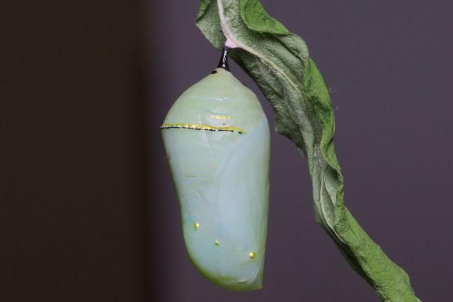 Monarch pupae are some of the most amazing creations of nature. Look at that pleasant blueish green colour and voluptuous shape! And what’s up with those gold ornaments? Turns out they’re not actually gold, but a combination of a structural colour and carotenoid pigments. Nobody really knows why all milkweed butterflies (family Danainae) have metallic-looking patches, though.